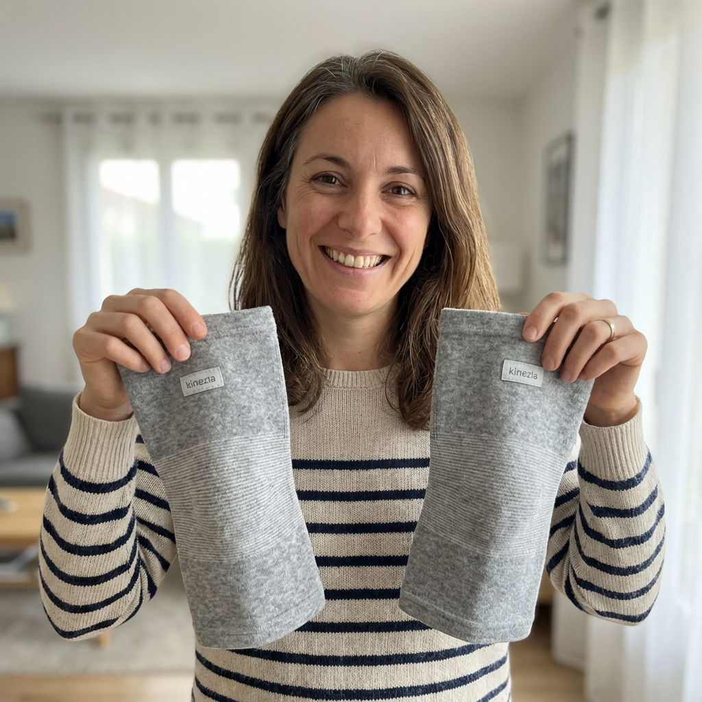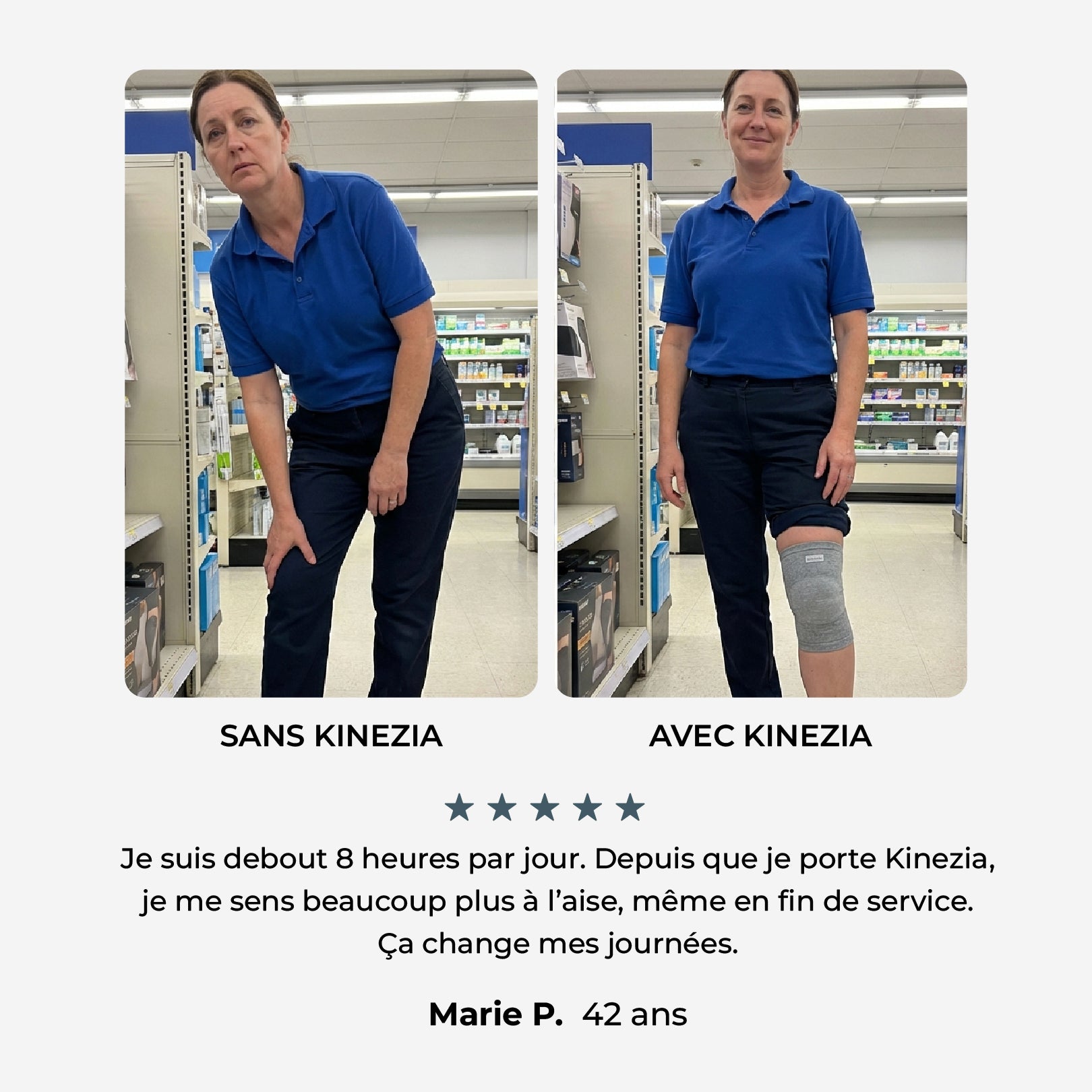 Je suis debout toute la journée en magasin et le soir mes genoux étaient vraiment lourds. Avec la genouillère Kinezia, je sens un vrai maintien et je termine mes journées beaucoup plus à l’aise. J’avais un peu peur que ça serre trop, mais finalement c’est confortable même après 8 heures.