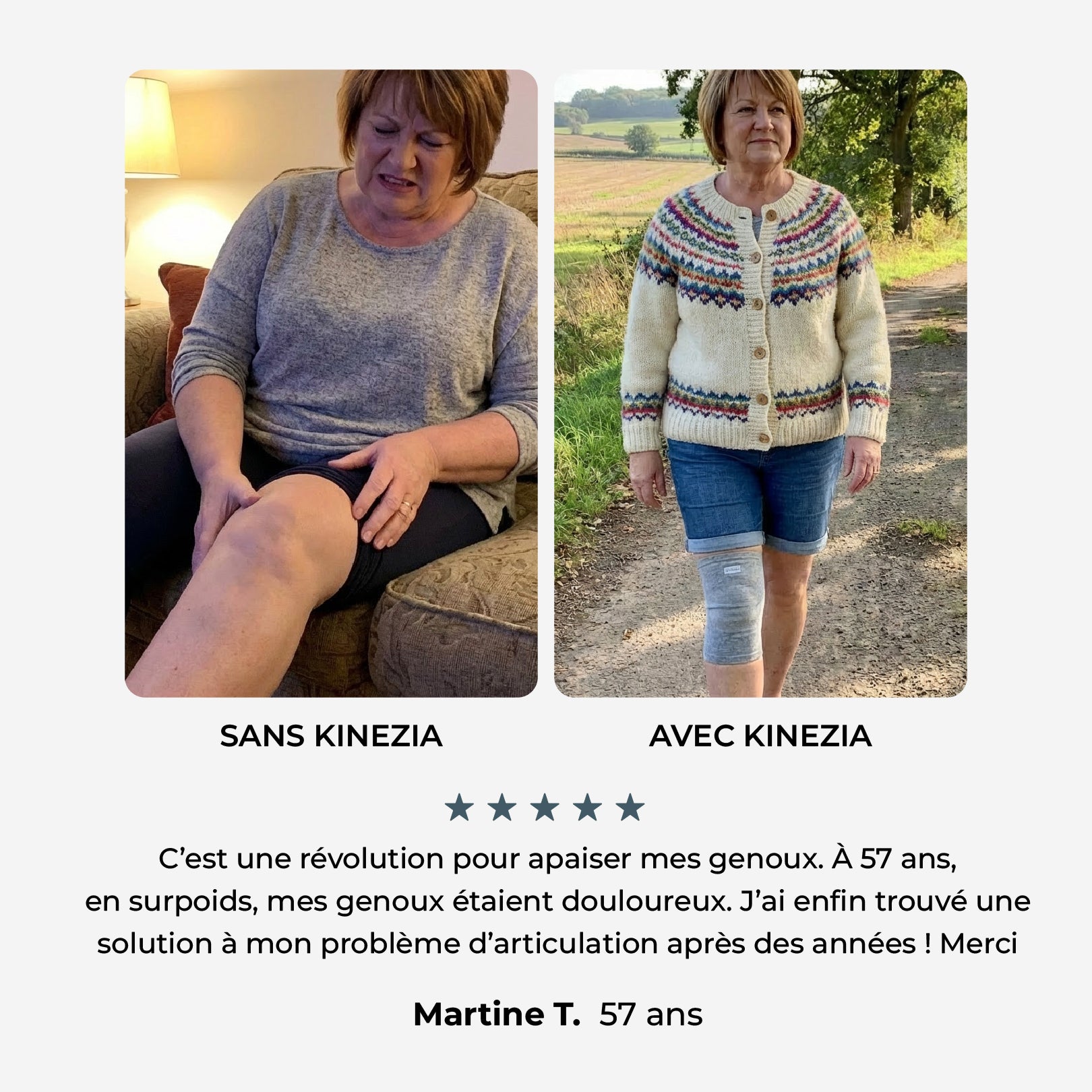 J'ai 59 ans, je suis coiffeuse donc debout toute la journée, et le soir mes genoux c'était l'horreur. Une collègue m'a parlé de Kinezia, j'ai regardé les avis, j'ai vu des femmes avec mes mensurations qui disaient que ça allait bien, j'ai commandé. Reçu en 5 jours, j'ai essayé direct : ça monte sans forcer (XL pour moi), c'est doux, ça gratte pas, et surtout ça tient en place toute la nuit. Au bout de 10 jours j'ai vraiment senti la différence, je me réveille moins la nuit et le matin je suis moins raide. Franchement pour le prix (j'ai calculé, ça revient à moins de 20 centimes par nuit si ça dure 6 mois), ça vaut vraiment le coup. En plus si ça va pas ils reprennent gratuitement, donc y'a pas de risque à essayer.